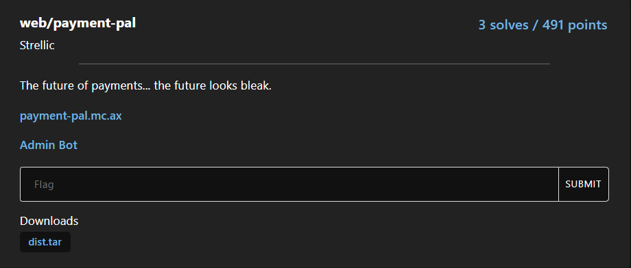 This was another one of my typical "onion" web challenges. Friends have started to notice that many of the challs I write involve a full web application where the solution requires layering multiple subtle vulns on top of each other (see noteKeeper, saasme, styleme, etc), and payment-pal was no different. It required chaining together some fun techniques, some of which I haven't seen in any other CTF challenge before.