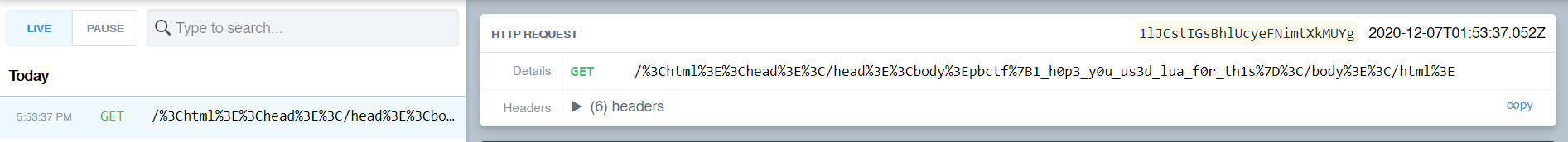 Then, we urlencode the payload, and add it to http://splash:8050/execute?lua_source=. So, when the scraper accesses this website, it'll run our lua script, and make a request with our flag.