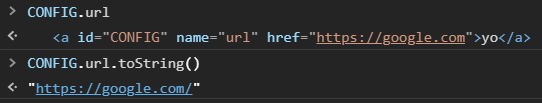 CONFIG.url gets set to https://google.com. How does this work? Well, if we check the value of CONFIG in the console, we see: