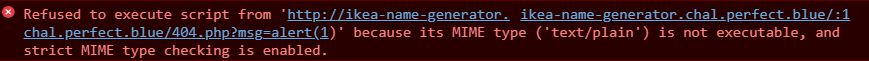 Hm... it looks like whatever we put in the msg parameter gets echoed out back to the page. My initial idea is to just place JS code in the msg parameter, then embed that using a script tag. Since it's on http://ikea-name-generator.chal.perfect.blue/, it should be allowed by CSP.