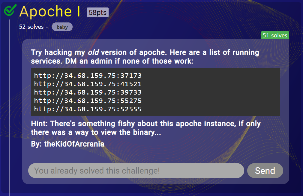 Apoche 1 was an interesting challenge where they say an old version of 'apoche' is being used. Checking online, I find nothing about 'apoche', and so I assume it has to be a custom web server binary. Going to the link, we see: