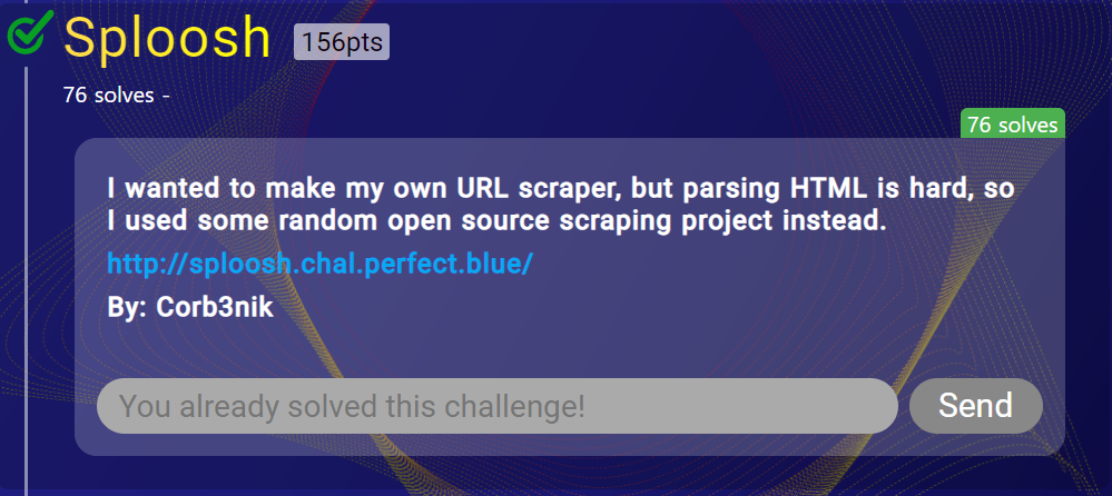This CTF was a ton of fun and I learned a lot. I did make some progress on XSP (but getting xs-leaks working correctly evades me for the 3rd time), and learned some Ruby for the first time from r0bynotes. My teammates this year were super amazing, and incredibly helpful in researching, investigating, and debugging when the shit I did went wrong. Special thanks to perfect blue for hosting a great CTF, and I hope to do well next year!