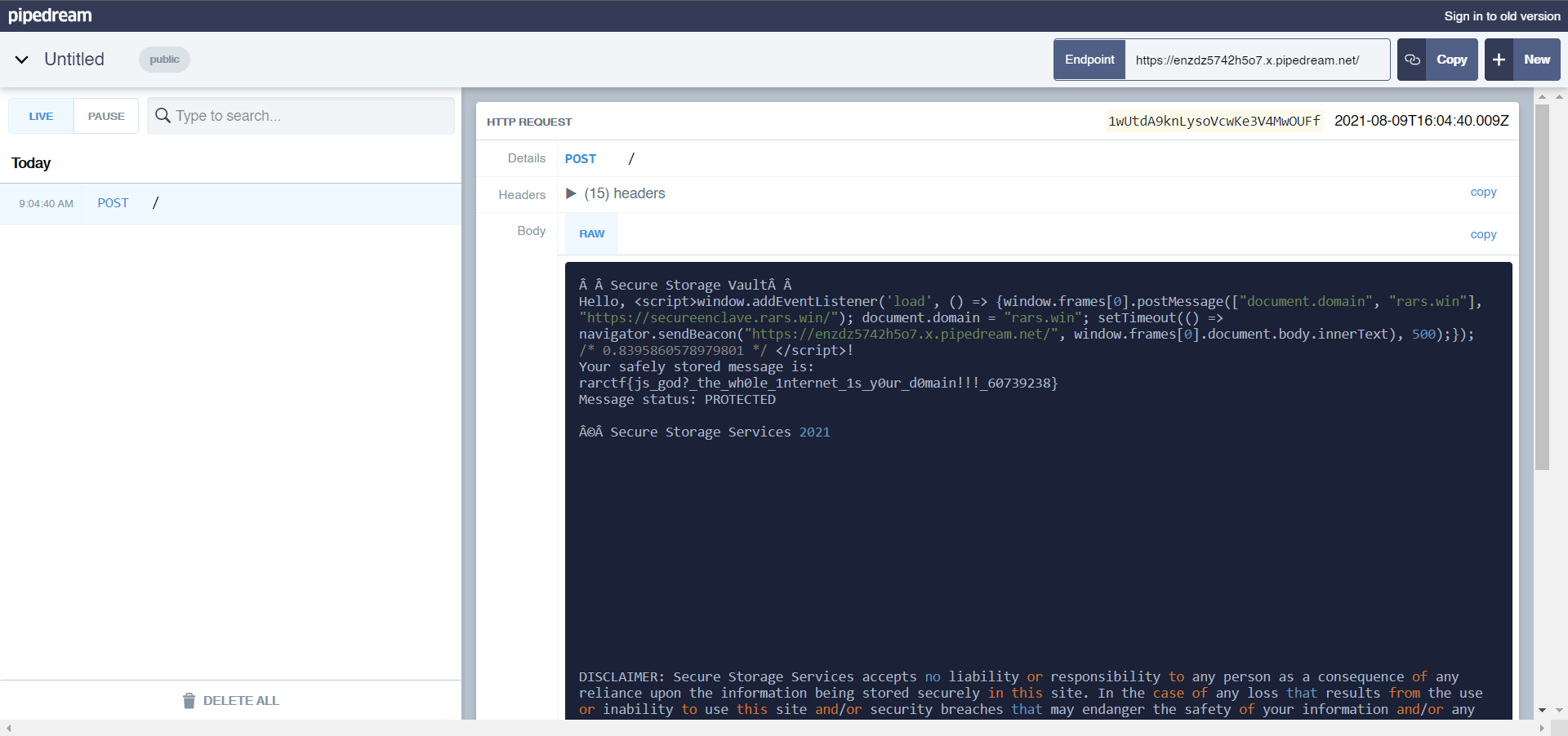 So, we can just log in with a simple <script> tag to get XSS and arbitrary JS execution on the storage site. But, as I said above, the flag is stored in the enclave, not on the storage site. And since the two sites have different URLs, (securestorage.rars.win and secureenclave.rars.win), the same origin policy (SOP) applies, and one cannot directly influence the other, so we're stuck not being able to read the flag.