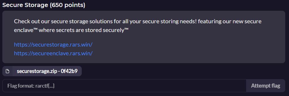 Secure Storage was a "hard" web challenge that I wrote for RaRCTF 2021. Truth be told, I really wasn't sure about the difficulty, but I think that it was in a good spot. It was my first challenge to end up in a CTF, so I was a little worried about the reception, but I'm glad a lot of people liked it.