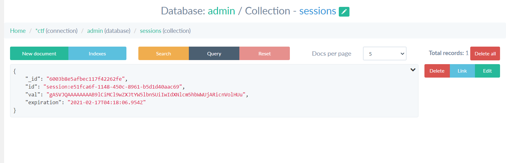 From here, we see the format of the document. I quickly whip up a BSON document that would insert a malicious session into this collection. Something similar to:
