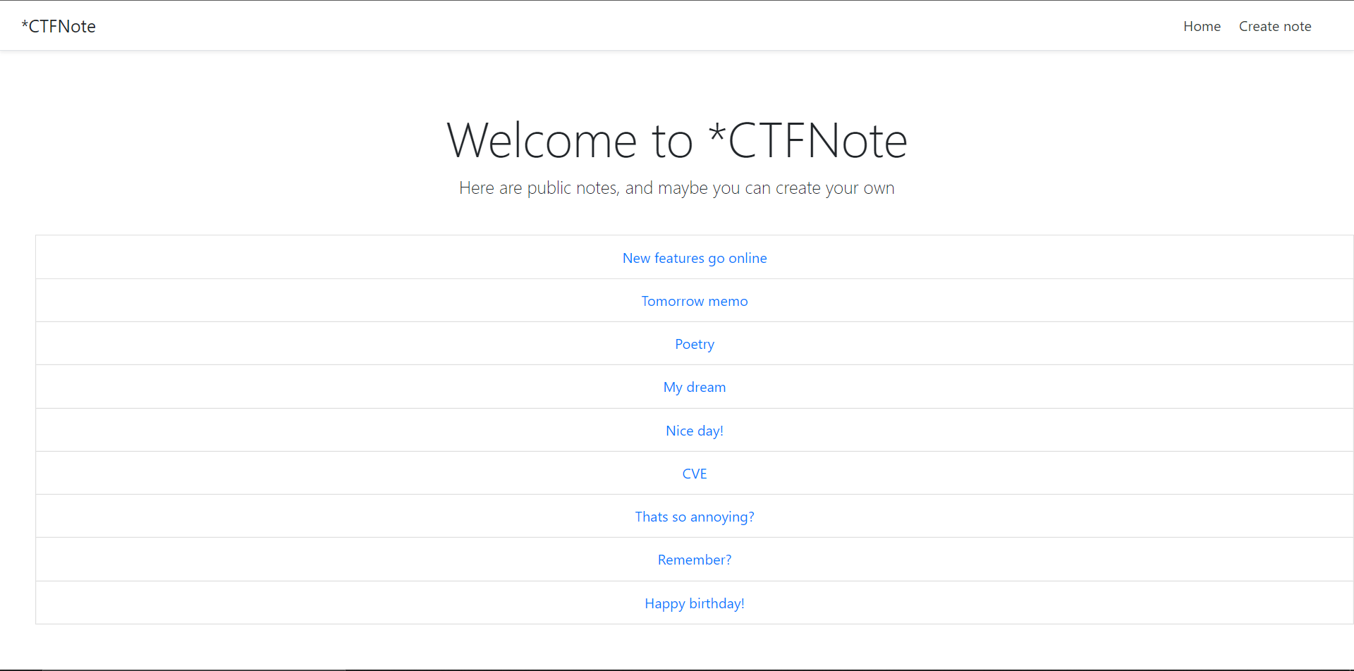 The website took you to "*CTFNote", a sort of pastebin where you could register and create notes and share them. The home screen had a list of all of the public notes. When creating a note, there was a checkbox to make the note private, so it wouldn't show up on the home screen. The goal to me was obvious: the admin had a hidden note with the flag.