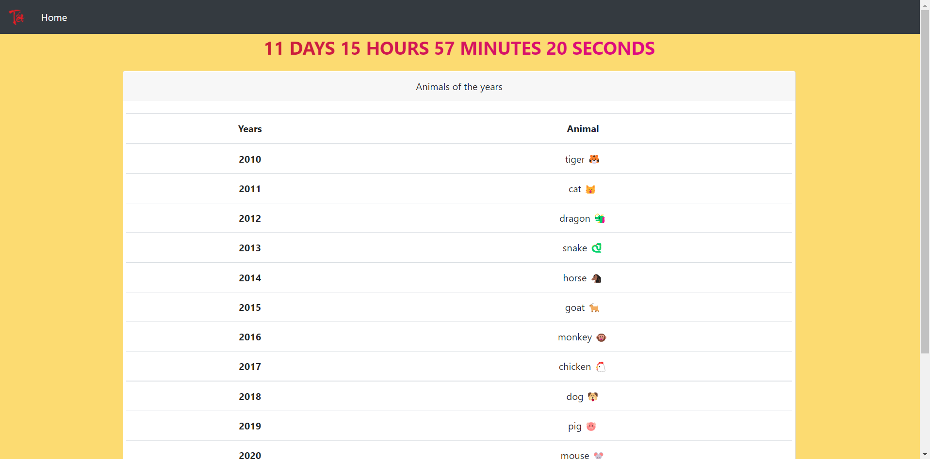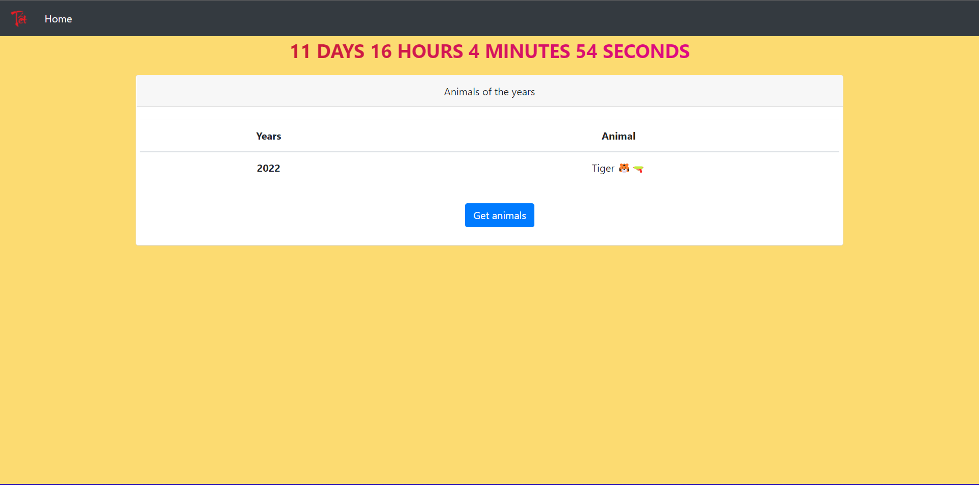 The first part of the "animals-countdown" challenge chain. Opening the site we're greeted by a simple page which shows the countdown until Chinese New Year, and a list of the animal corresponding to each year. If we click the "Get animals" button, a longer list of animals appears: