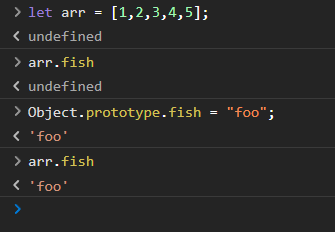 In this image, an array arr is defined, and the property fish is checked on it. This property of course doesn't exist initially, but when we add it to Object.prototype, suddenly arr.fish exists! The prototype object Object.prototype is mutable at runtime, so if we modify this object to add a new property, every object that has a prototype which descends from this prototype chain (which is every object) suddenly has a new property!